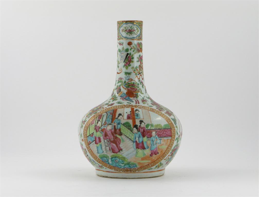 A Chinese Canton famille rose bottle vase, painted with panels of figures, 19th century, 33cm.
