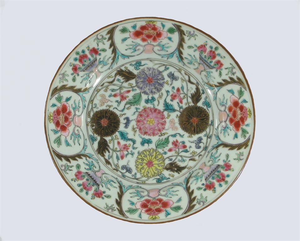 Eight Chinese famille rose plates, variously decorated with flowers, birds and horses, all 18th century, 22cm. Mounted in glazed frames. (8)