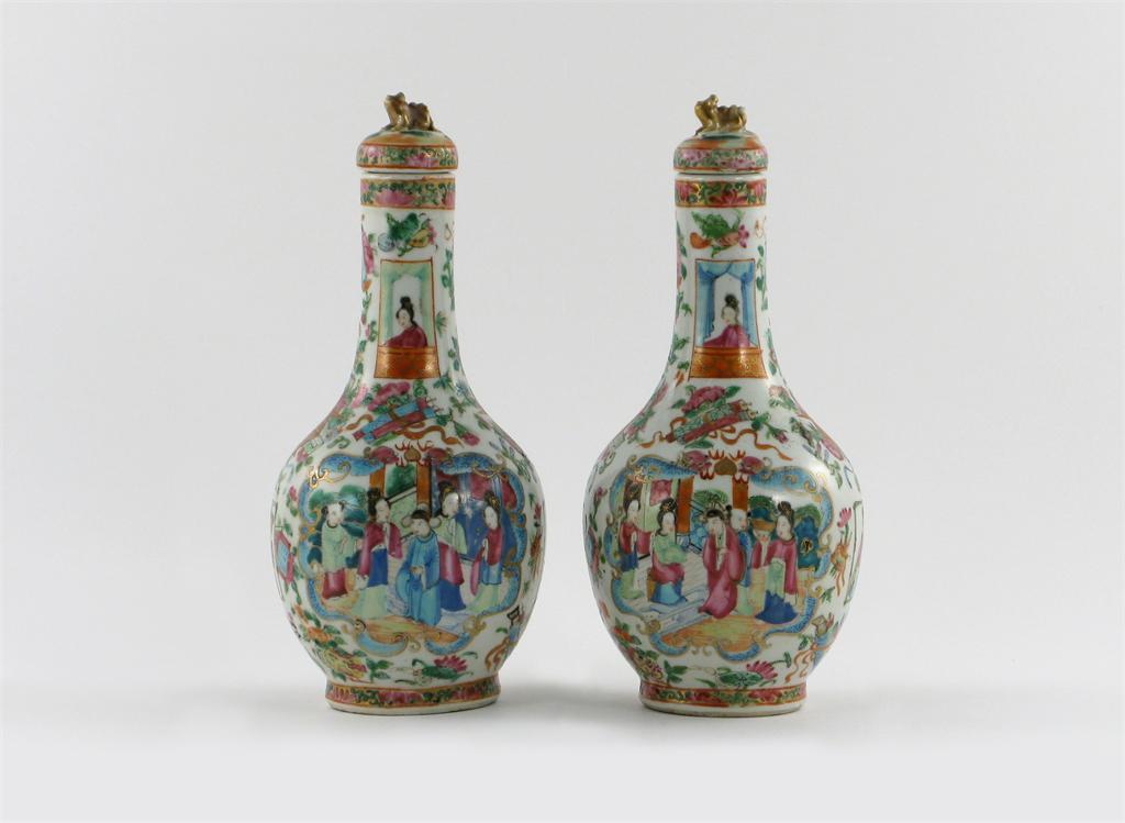 A pair of Chinese Canton famille rose bottle vases and covers, brightly painted with panels of figures, 19th century, small chips to the finials, 26cm. (4)