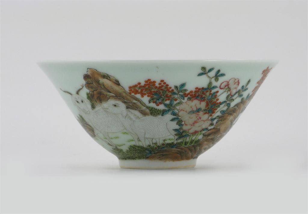 A Chinese polychrome conical bowl, painted with three goats in a rocky landscape, and with flowering prunus, the reverse with a panel of calligraphy, the reverse with a Daoguang seal mark but later, 13.4cm.