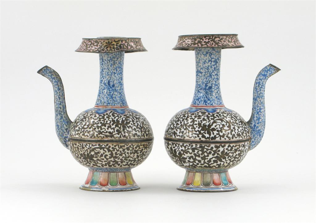 A pair of Chinese Canton enamel ewers, decorated with an allover continuous foliate scroll above lappet bordered feet, 18th century, some damage and repairs, 15cm. (2)