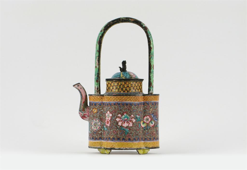 A Chinese Canton enamel ewer, the cover with a lion dog surmount, the quatre-lobed body painted with flowers on an aubergine ground, 18th / 19th century, extensive damage, 19cm. (2)