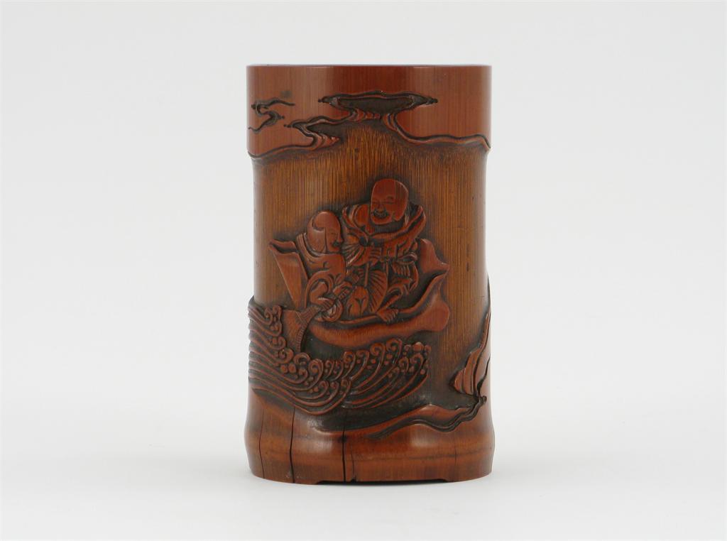 A Chinese bamboo brushpot, carved with two figures in a boat, riding on waves, 19th century, 11.9cm.