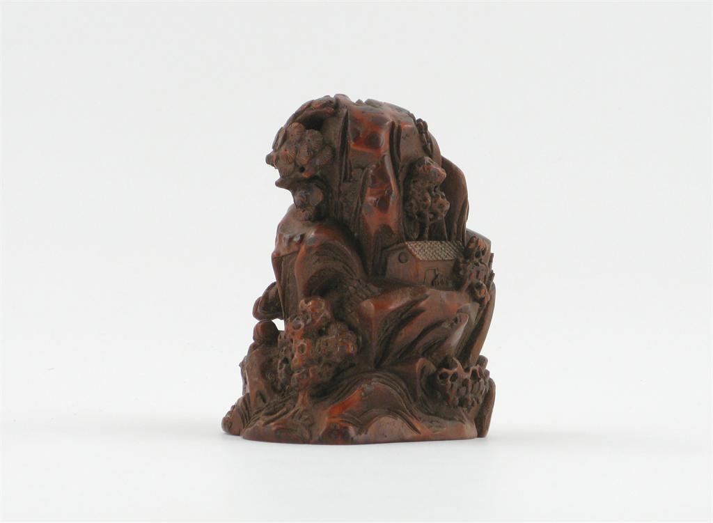 A Chinese bamboo carving, of a rocky outcrop with pine trees, buildings and a seated figure beside a bird, probably 19th century, minor faults, 13cm.