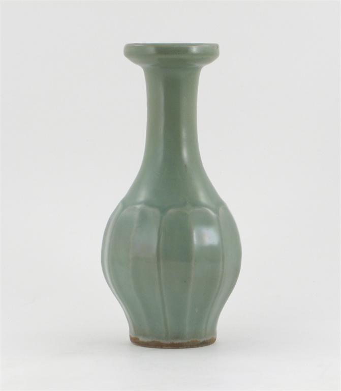 A Chinese Longquan celadon vase, with a flared rim, the body moulded with a wide band of lappets, c.1400, a small chip to the rim, 25cm.