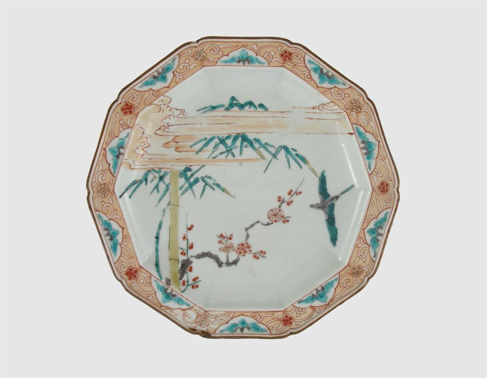 A Japanese decagonal dish, decorated in polychrome with a green and aubergine bird, a flowering prunus branch and bamboo, early 18th century, a large section broken and reglued, 21cm.