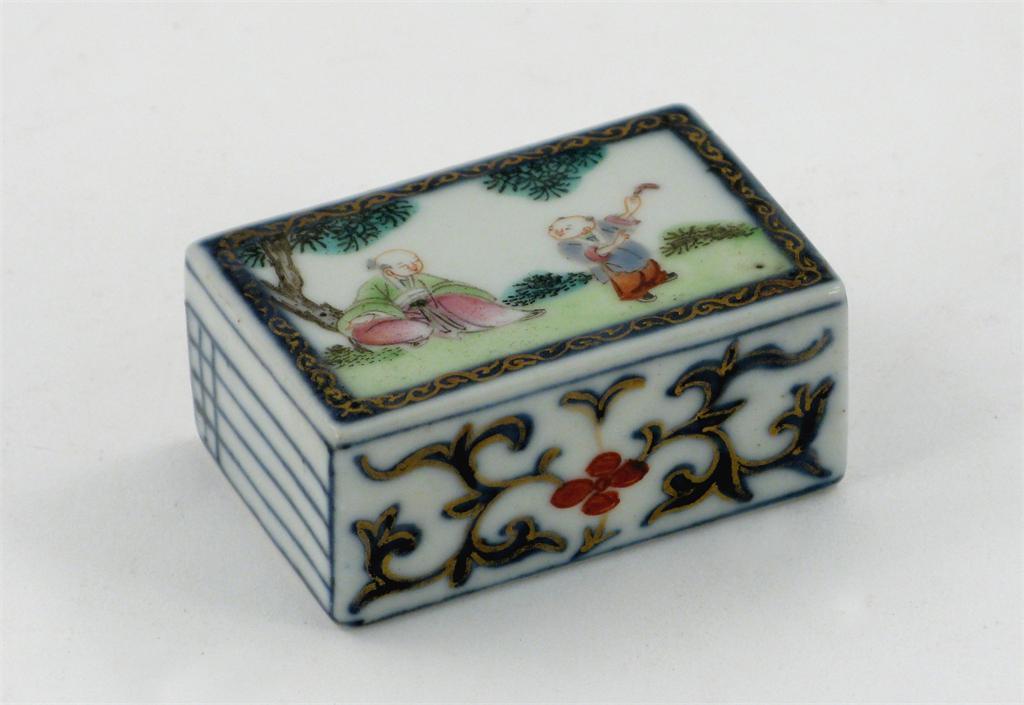 A Chinese porcelain weight, modelled as a book, the top with two figures beneath a pine tree, 19th century, 5.4cm.