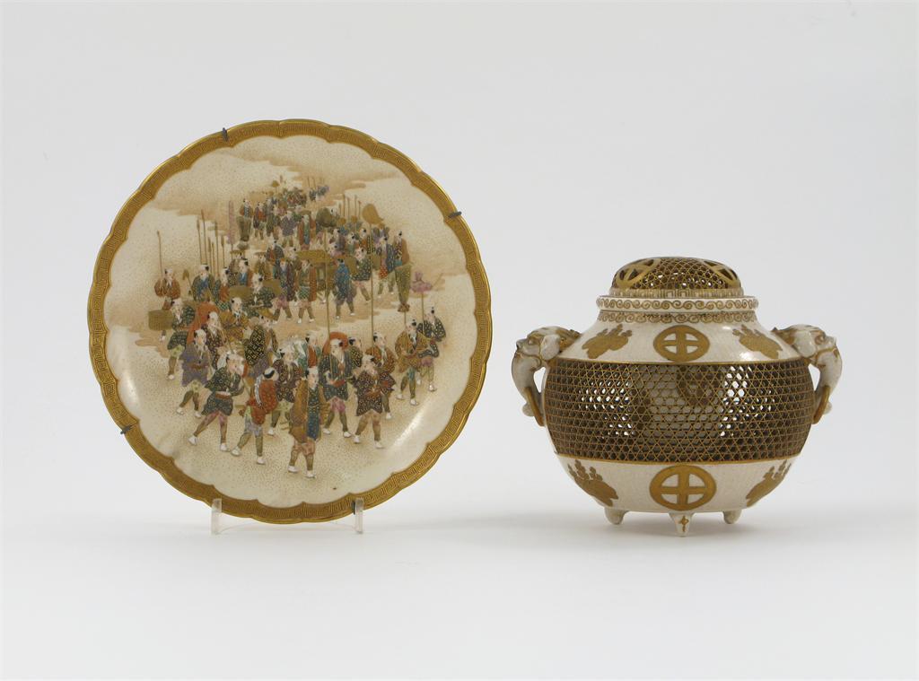 A Japanese Satsuma dish with a scalloped rim, painted with a winding procession, two character mark, and a Satsuma koro, cover and liner, with reticulated sides, all Meiji 1868-1912, the koro damaged, 18.5cm max. (4)