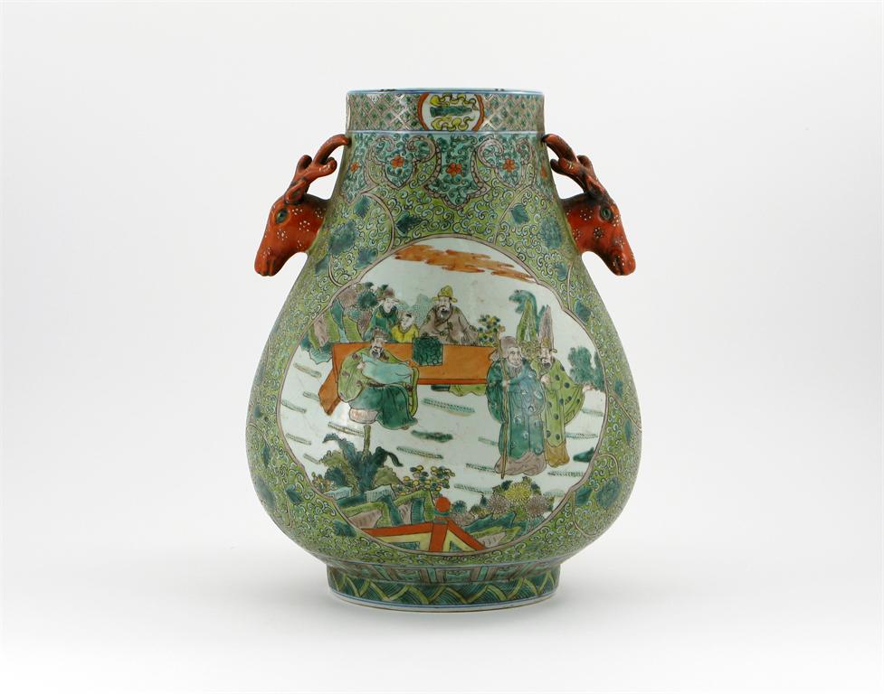 A Chinese hu-shaped vase, painted with panels of figures at tables and in gardens, and a green ground of scrolling foliage, the neck with a six character Guangxu mark but probably later, 36cm.