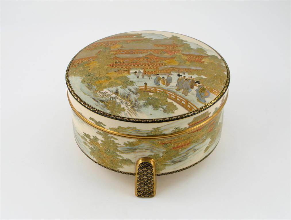 A large Japanese Satsuma circular box and cover, richly decorated with figures in a pagoda landscape, the sides with mountains, water and pine trees, the base with a three character mark, and raised on three feet, early 20th century, 27cm. (2)