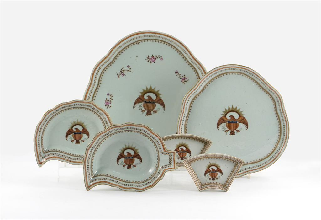 Six dishes from a Chinese armorial service, decorated with the Great Seal of the United States of America, within gilt and iron red formal borders, 19th century, 35.3cm max. (6)