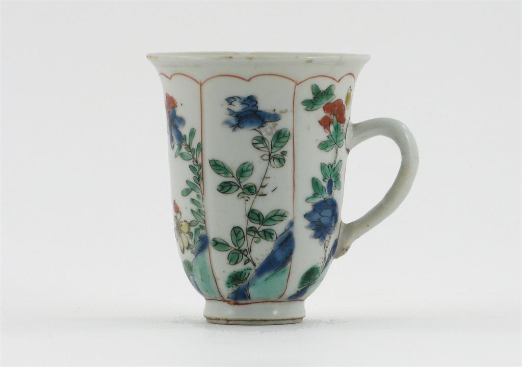 A Chinese famille verte deep U-shaped cup, decorated with panels of flowers and foliage, Kangxi 1662-1722, hairline cracks and damage to handle, 9cm.