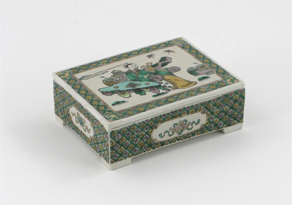 A Chinese famille verte enamel on biscuit rectangular box and cover