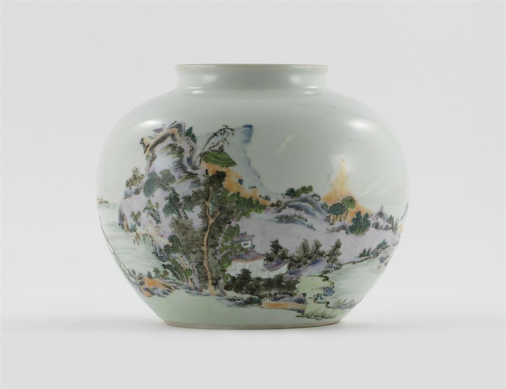 A Chinese famille rose circular vase, with a short flared neck, painted with a continuous scene of a hermit seated on a promontory in a mountain river landscape, 18th century, 18cm high.