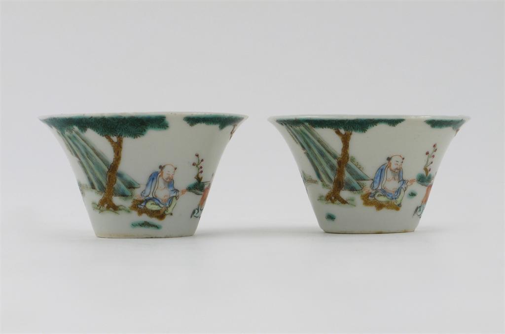 A small pair of Chinese flared bowls, each painted with three figures, one with a cooking pot, the bases with six character Daoguang marks in iron red and of the period 1821-50, 6.2cm. (2)