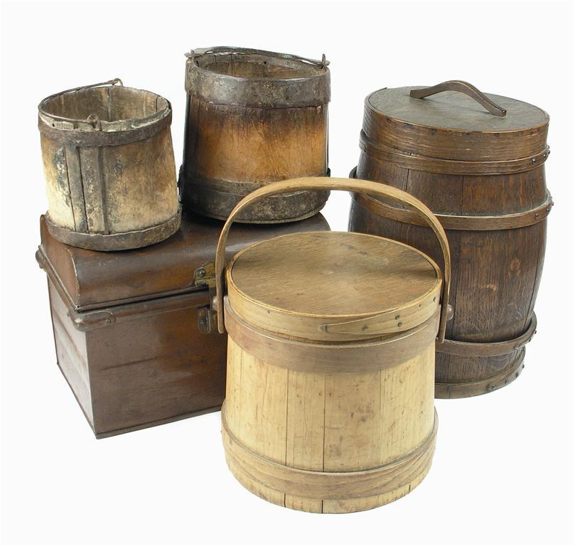 A shaker staved soft wood and bound cylindrical bucket, with cover and swing handle, 10in (25.5cm) h, a similar oak barrel and cover, two metal bound scoops and a painted tin box with a brass lock stamped 'Bate ... npton'. (5)