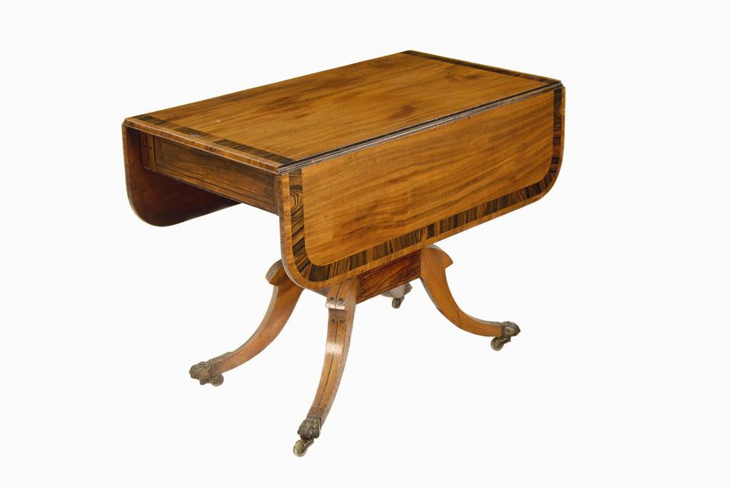 A late Regency mahogany supper table, inlaid ebonised stringing, the drop-leaf top with calamander cross banding, above two frieze drawers on scroll supports to hipped downswept legs, brass paw sabot and castors, 28.5in (72cm) h, 42 x 38in (106.4 x 96.5cm) open. Repairs and cracks to legs.