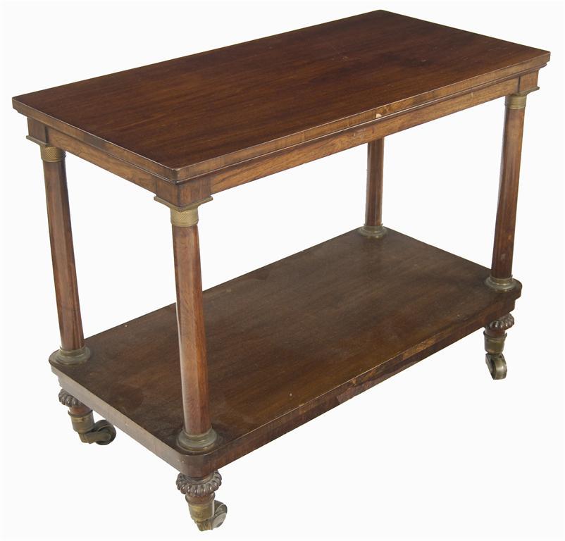 A rosewood and mahogany buffet, the later top on turned column supports with gilt metal mounts, on lobed feet, brass caps and castors, 29.5in (75cm) h, 38in (96.2cm) w, 19in (48.4cm) d. Provenance: From the estate of Pauline, Lady Rumbold, deceased.