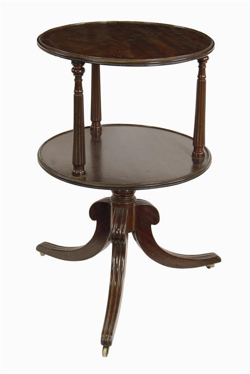 A 19th century mahogany dumb waiter, the revolving two tier top on hipped and moulded downsept legs and brass castors, 36.75in (93.3cm) h, 29in (73.3cm) w. Restoration and replacements.