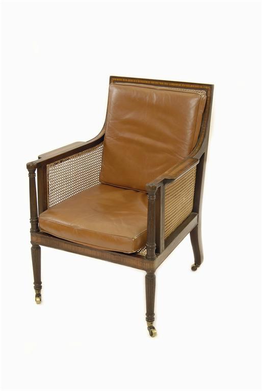 A late 19th century mahogany bergere armchair, satinwood banding and stringing and having turned tapering fluted supports and turned tapering ribbed legs with brass castors and later squab cushions.