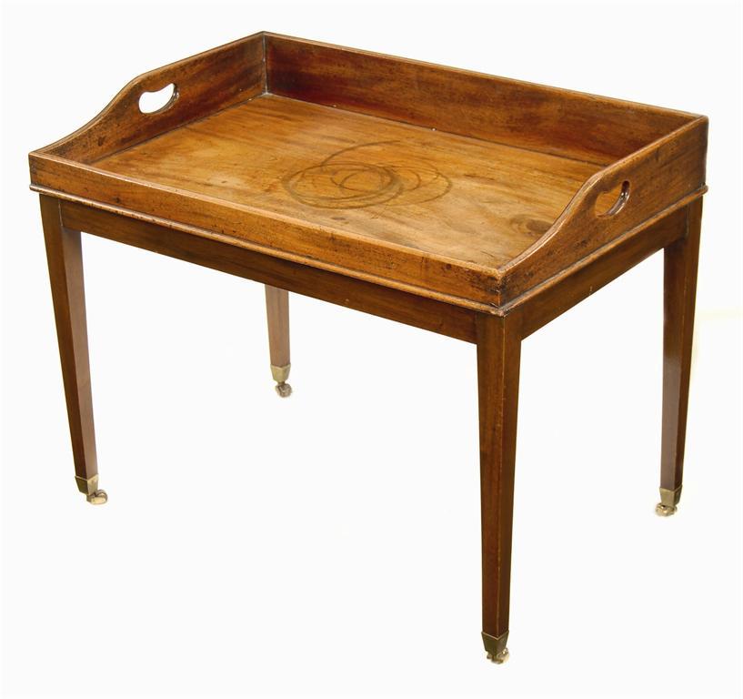An early 19th century mahogany butler's tray, with pierced side handgrips and on a later stand, 23.75in (60.5cm) h, 30in (76.5cm) w, 19.5in (49.5cm) d.