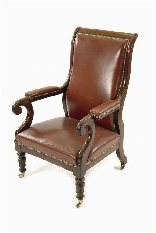 A Victorian mahogany library open armchair, with later brass studded leather upholstery.