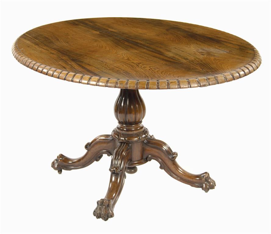 A William IV rosewood loo table, the oval tilt-top having a nulled edge on a reeded baluster stem with lappet moulded downswept legs and carved paw feet and brass castors, 28.35in (72cm) h, 52 x 40.25in (132 x 102cm).