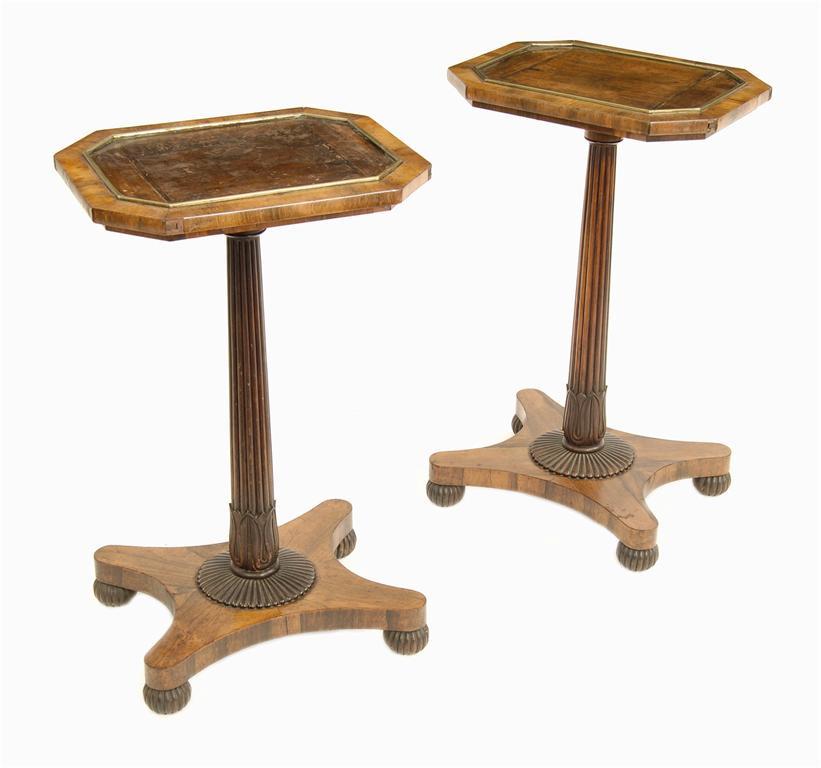 A pair of William IV rosewood stands, the octagonal hinged tops with an inner brass moulding, previously ratcheted, on tapering ribbed and carved leaf stems, 29.75in (75.5cm) h, 18in (46cm) w, 14.75in (37.5cm) d. (2) The centre of the tops previously filled, the reverse leather lined to a mahogany ground.