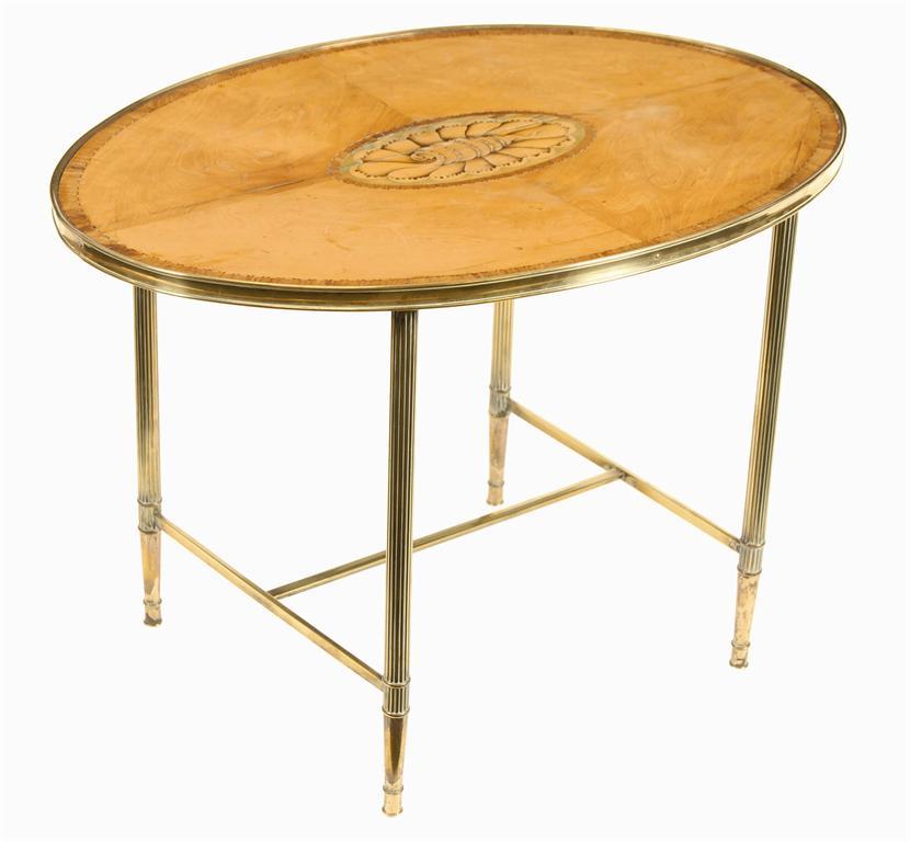 An oval occasional table, the satinwood and marquetry top inset into a brass base, 20.75in (52.5cm) h, 30in (76.3cm) w, 21.75in (55cm) d.