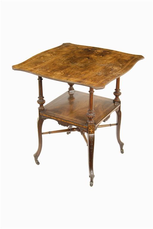 A late Victorian rosewood two tier occasional table, marquetry inlaid, 28.5in (72.5cm) h, 25.75in (65.5cm) w.