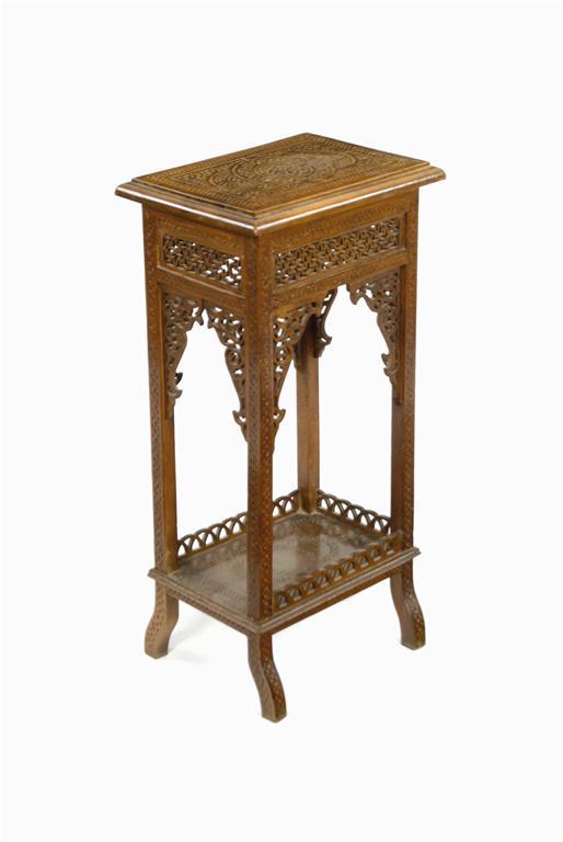 A Moorish carved and pierced walnut occasional table, 26.75in (68cm) h, 13.75in (34.6cm) w, 9.75in (24.5cm) d. Section of gallery lacking.