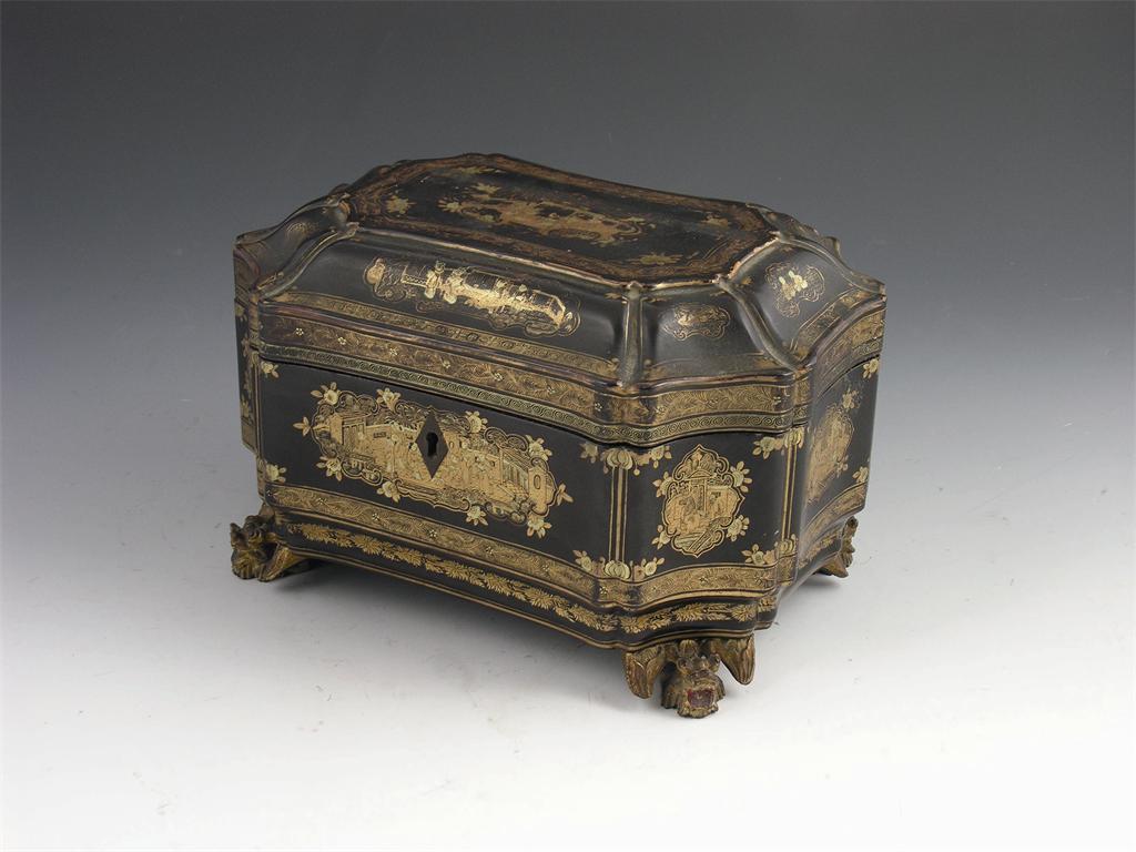 A Chinese Export lacquer tea caddy, of concave octagonal outline, the hinged cover revealing a pair of pewter canisters, raised on dragon feet, 6in (15cm) h, 9.75in (25cm) w, 7in (18cm) d. Decoration to the cover worn, hinges broken, canisters dented.