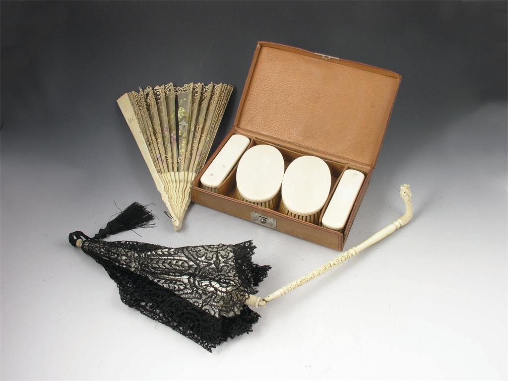 A set of ivory backed brushes, a pair of oval backed and a pair of rectangular and together with an ivory handled button hook, contained in a leather travel case, initialled 'H.R.F', 10.75in (27.5cm) h, a parasol with a Chinese carved ivory dragon handle with an articulated tongue and a European fan with ivory sticks. (3)