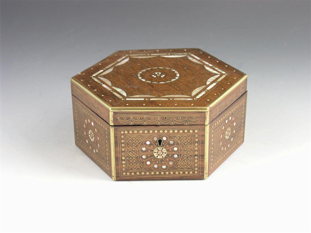 A rosewood, brass and mother of pearl inlaid octagonal box, with a burr veneered and plush lined interior, 3.25in (8cm) h, 7.25in (18.5cm) w.