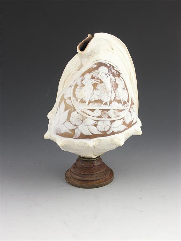 An Italian carved cameo conch shell, decorated musical maidens, the base hollowed for a light, on a turned wood base, early 20th century, 10.5in (26.5cm) h.