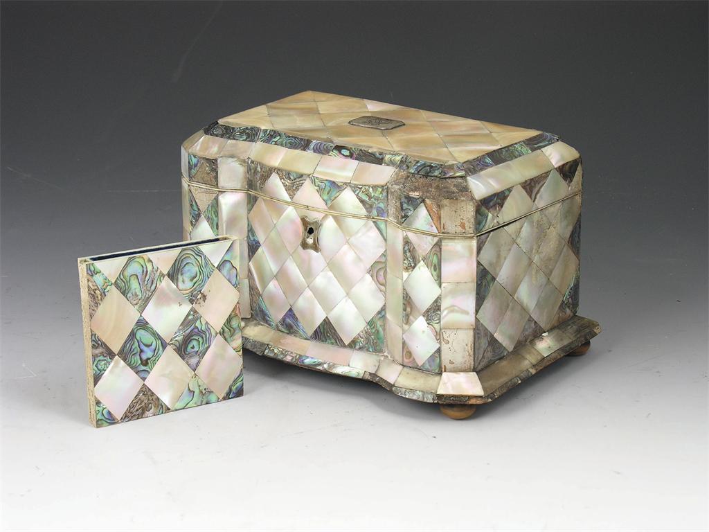 An early Victorian mother of pearl and abalone breakfront tea caddy