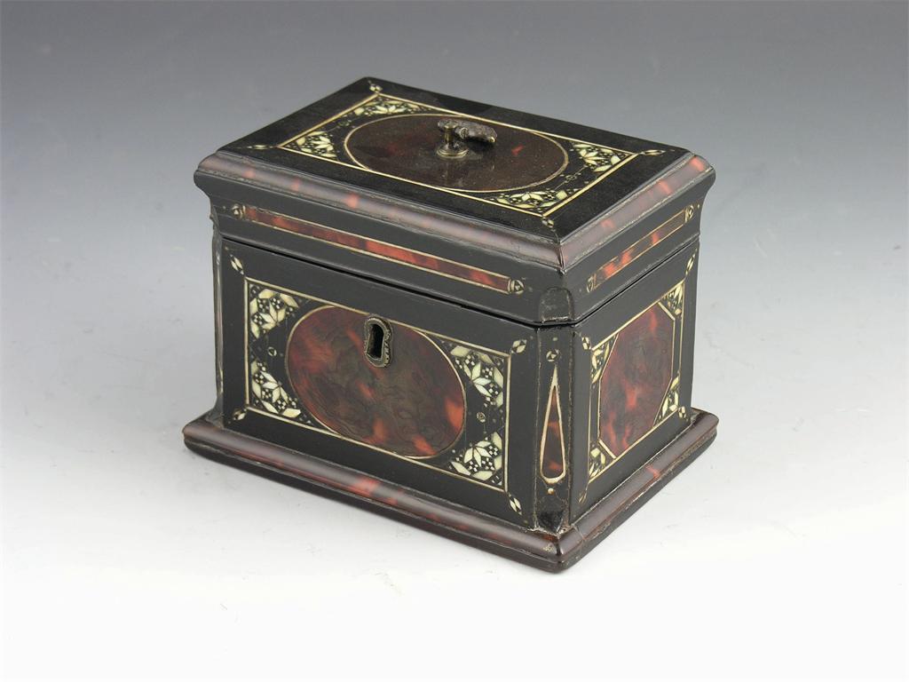 A mid 18th century Dutch ebonised, tortoiseshell and ivory tea caddy, of rectangular form with canted angles, the hinged cover revealing a pair of octagonal compartments with brass handled lids, 4in (10cm) h and d , 5.5in (14cm) w.