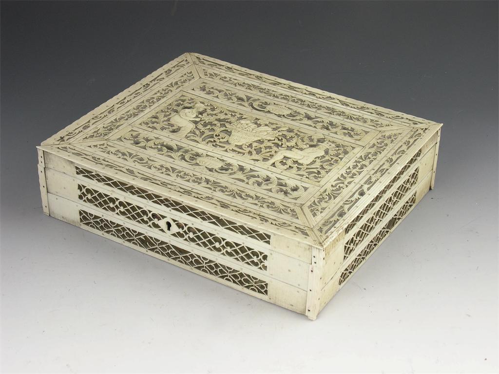 An early 19th century French pierced ivory and brass backed work box, with a hinged cover centred a vase of flowers flanked by a seated woman and gentleman with a paper lined interior, 3in (7.5cm) h, 11.5in (29cm) w, 9in (24cm) d.