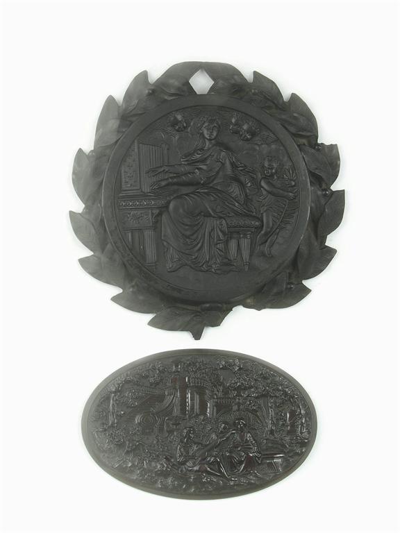 A French Bois Durci circular plaque, depicting St Cecilia seated at an organ with cherubs surrounding, 8.75in (22cm) dia, losses to laurel border, and a Bois Durci oval panel of a musician with two admirers in garden landscape, both mid 19th century. (2)