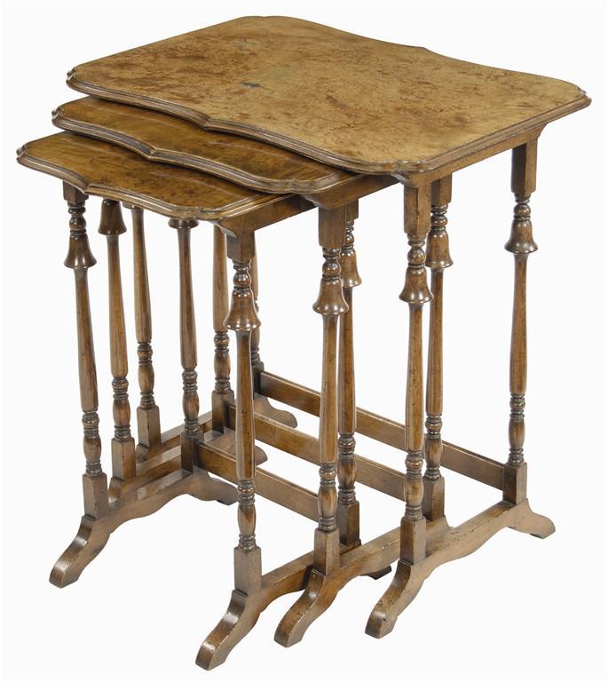 A nest of three walnut occasional tables, each with a burr veneered serpentine moulded edge top, early 20th century, 22in (55.6cm) h, 20.75in (52.8cm) w, 15in (38cm) d. (3)