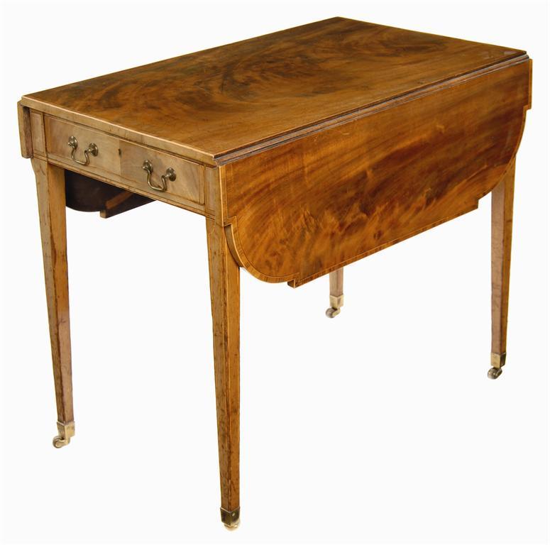 A George III mahogany Pembroke table, inlaid stringing, the rosewood banded top with breakfront drop leaves, above a frieze drawer fitted replaced brass handles, on square tapering legs and replaced brass caps and castors, 28.75in (72.8cm) h, 41.25 x 34.25in (104.8 x 86.7cm) open. Restoration.