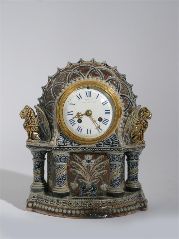 A rare Martin Brothers stoneware mantel clock by Robert Wallace Martin, modelled with Ionic pillars and winged lion capitals, incised with panels of geometric flowers, in shades of green, blue and brown, with Lund & Blockley movement incised 18 R W Martin London 12-1874, small flat chip to base rim 21cm. high
