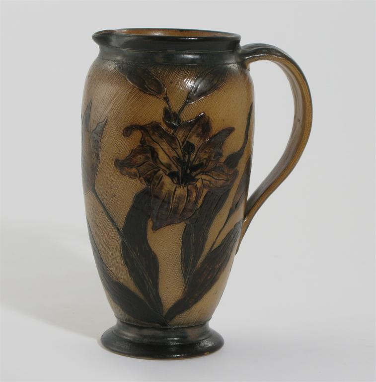 A Martin Brothers stoneware jug incised with lily sprays on a textured ground