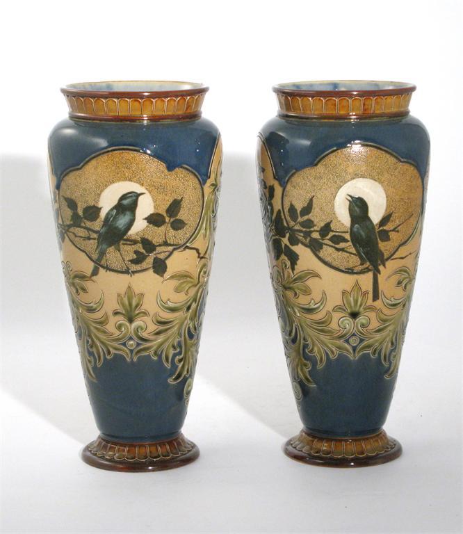 A fine pair of Doulton Lambeth stoneware vases by Florence Barlow, slender, shouldered form, pate sur pate decorated with nightingales singing before a full moon, incised scrolling foliage borders, in shades of green, blue, brown and white on a buff ground impressed and incised marks 36cm. high