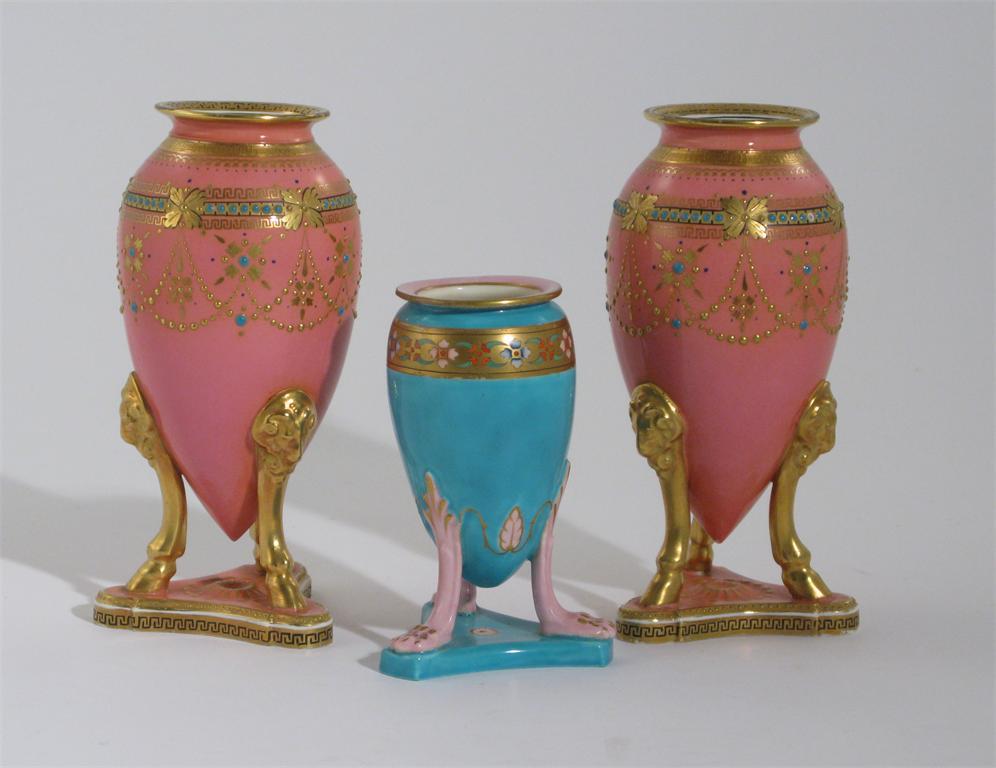 A pair of Cloissone Urn shaped vase, probably Minton, each on tripod feet, glazed pink with enamel and gilt decoration, and a smaller blue vase unmarked 18.5 cm. high