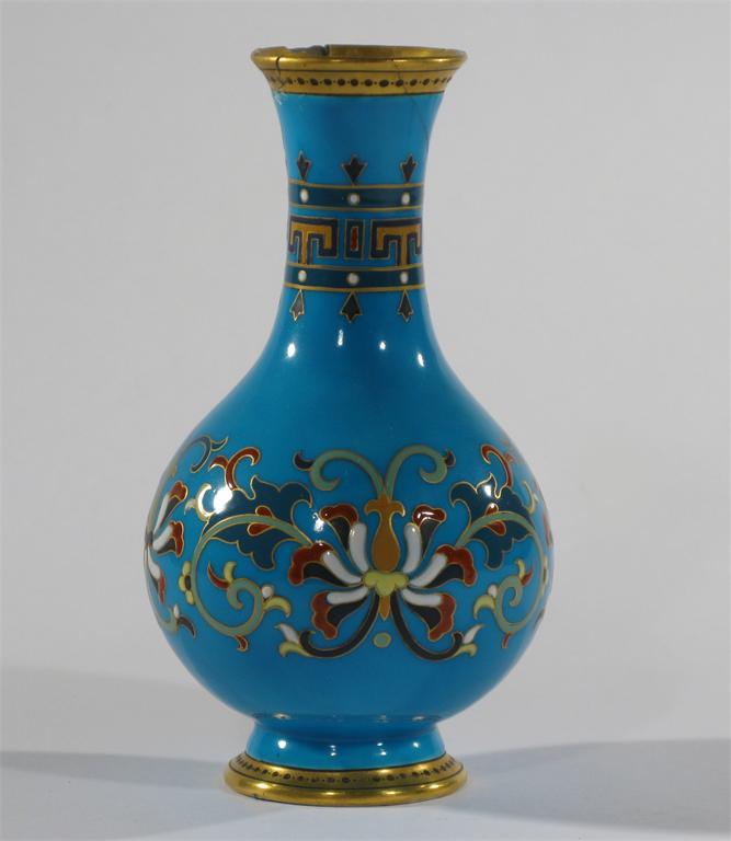 A Minton Cloisonne vase enamelled in colours and highlighted in gilt with a band of stylised honeysuckle, on a turquoise ground impressed marks, repaired damages 16.5 cm. high