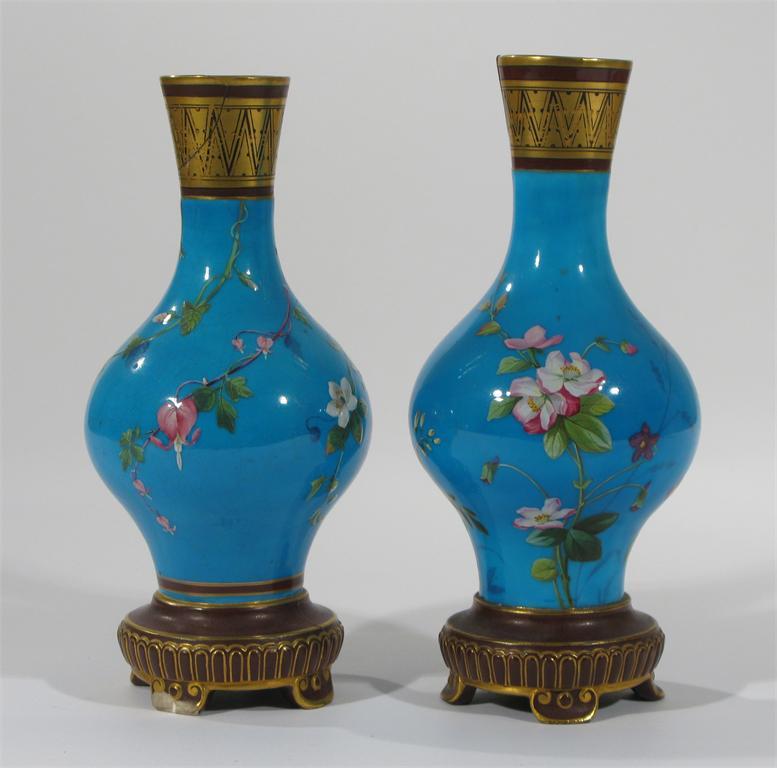Two Minton Cloissone vases the design attributed to Dr Christopher Dresser, on moulded faux wood stand, each painted with wild flowers including viola, blossom, bleeding hearts, in colours and gilt impressed marks, damages 19 cm. high