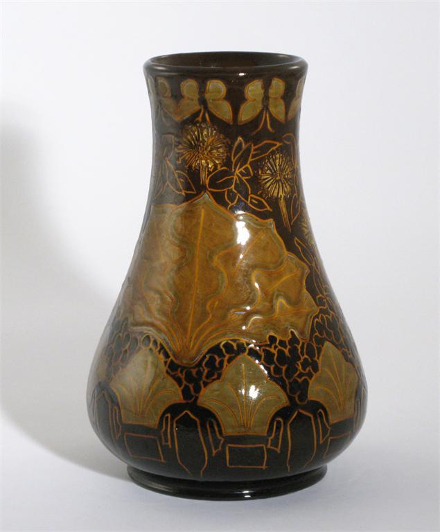A Wedgwood Pottery Marsden Ware vase shouldered form incised and slip decorated with dandelion clocks below a band of butterfly, mark concealed by glaze 26 cm. high