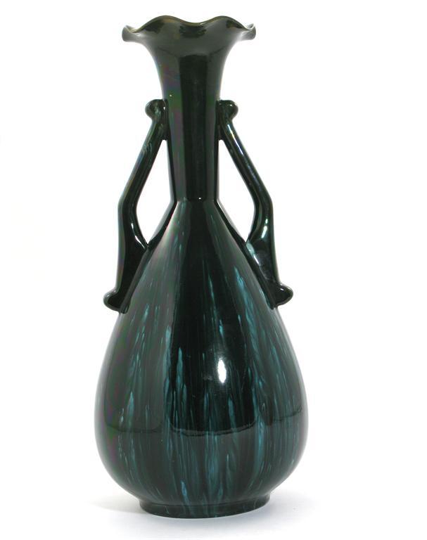 A Linthorpe Pottery vase designed by Dr Christopher Dresser, model no.2077, slender form with everted rim, applied angular handles, covered in a streaked green glaze impressed marks, restoration to the top rim 38 cm. high