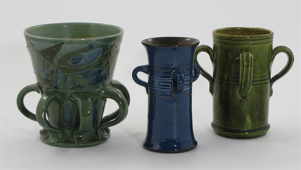 A C H Brannam, Barum vase, probably retailed at Liberty & Co, flaring conical form with seven looped handles, incised and painted with fish and two other pottery vases incised marks, FB monogram dated 1906, minor chips, 17 cm. high